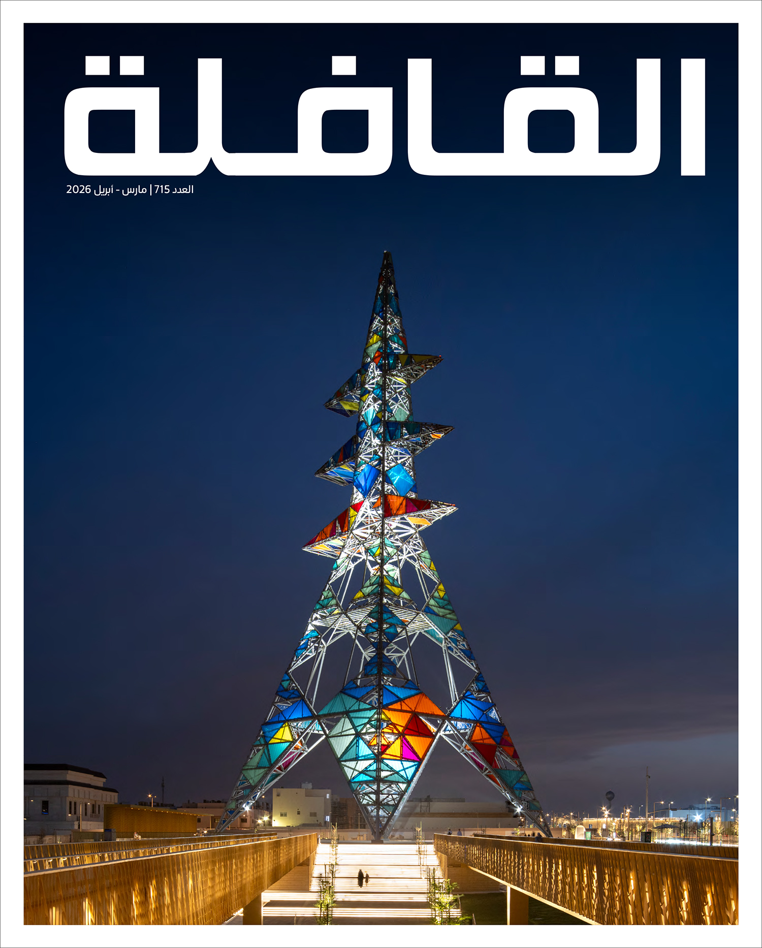 غلاف العدد الجديد من مجلة القافلة (مارس-أبريل 2026م)، ويظهر فيه عمل الفنان السعودي عبدالناصر غارم "برج الفنون"، الذي يقع في المسار الرياضي بمدينة الرياض. (تصوير: عبدالمجيد الروضان).