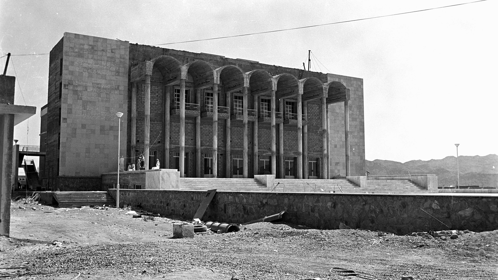الواجهة الأمامية لقاعة المحاضرات الكبرى تزدان بالأقواس وهي تمر الآن باللمسات الفنية الأخيرة.