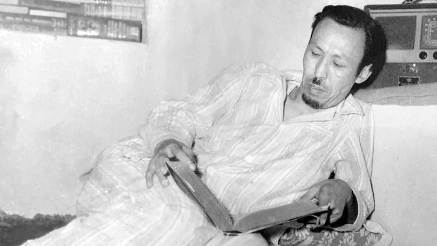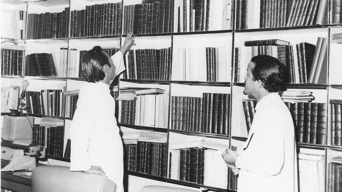 عزيز ضياء في مكتبته الشخصية في السبعينات الميلادية.