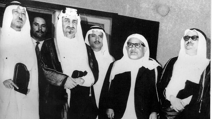 جلالة الملك فيصل و على يمينه عزيز ضياء و على يساره حمد الجاسر أثناء قمة الإسكندرية عام 1963م.