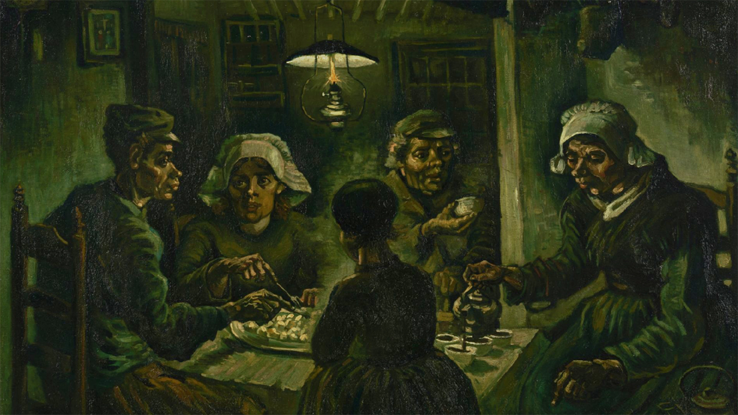 “آكلو البطاطس" لفينسينت فان جوخ (1853م – 1890م)، نوينين، أبريل-مايو 1885م زيت على قماش ، 82 سم × 114 سم. شكر وتقدير: متحف فان جوخ، أمستردام (مؤسسة فينسينت فان جوخ).