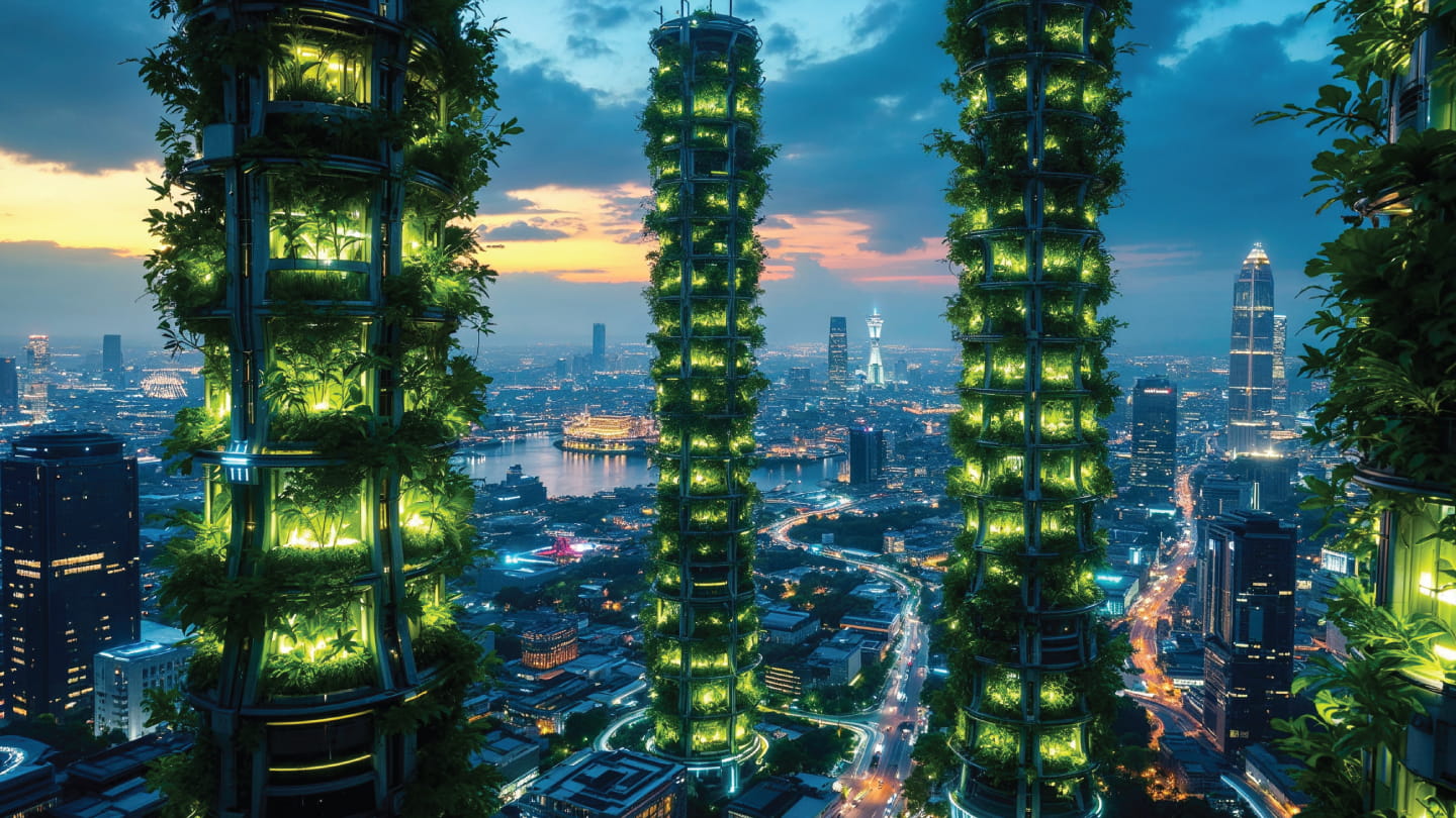 مدن المستقبل تُُزهر في السماء، حيث تتحوّّل ناطحات السحاب إلى مزارع كهربائية تنتج الغذاء بكفاءة تفوق ضوء الشمس.
