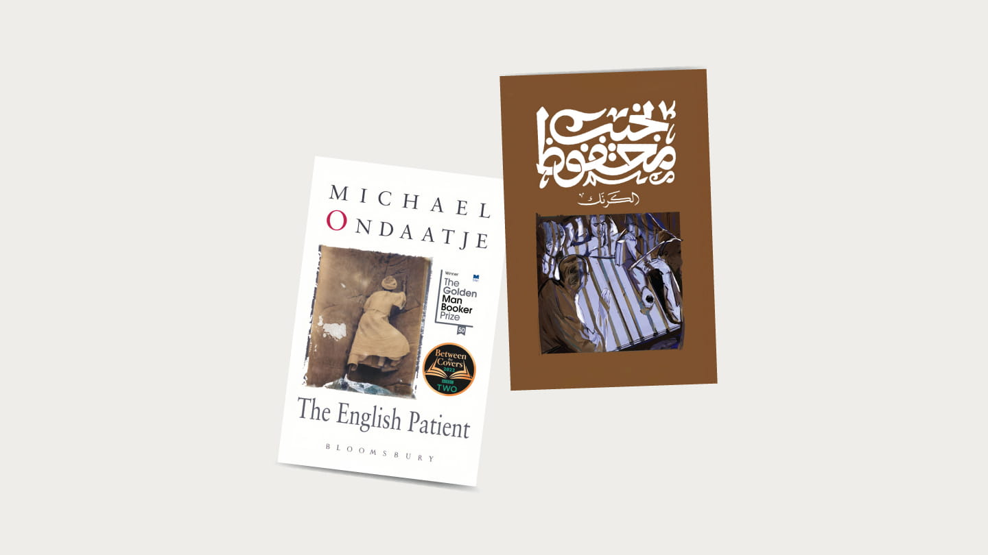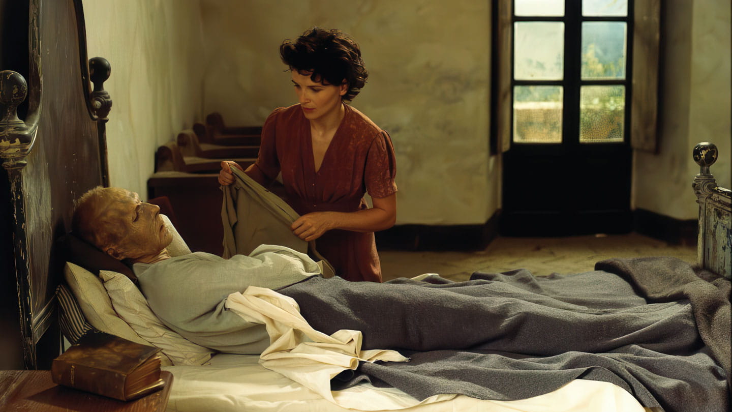 مشهد من فِلم "المريض الإنجليزي"، من بطولة: رالف فاينس، وجولييت بينوش، وكريستين سكوت توماس، وويليم دافو.