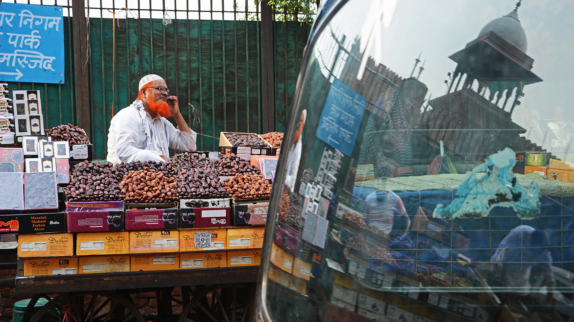 بائع فواكه مجفَّفة يعمل في شوارع دلهي الصاخبة. تستخدم هذه الفواكه مع قشطة الحليب في أطباق تقليدية عريقة مثل سمبوسة الخويا.