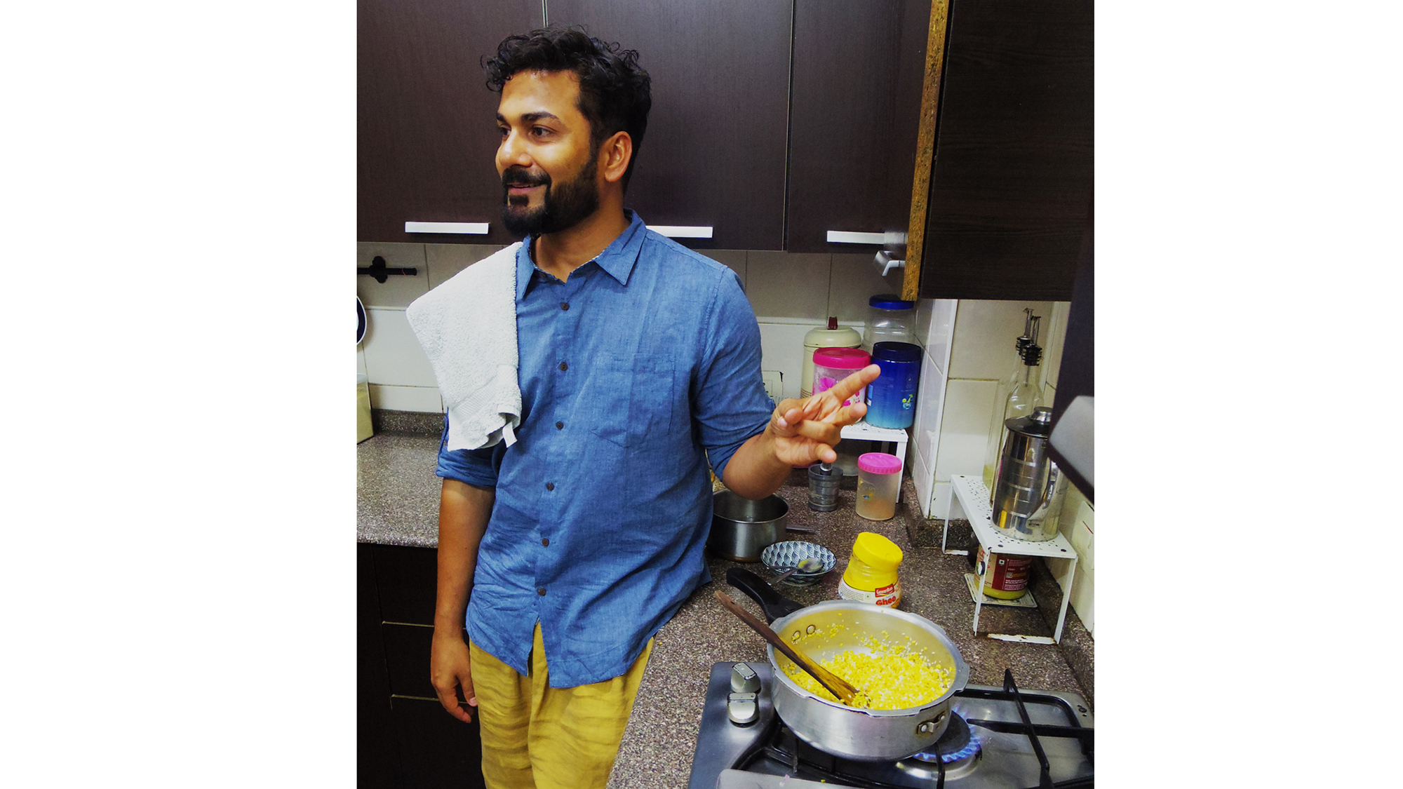 "ما نعدّه في المنزل يحتوي على نسبة أعلى من الأرز وأقل من العدس"، يقول حسين وهو يحمِّص الحبوب معًا قبل أن يضيف بضع حبات من بذور الحلبة (ميثي دانا) ورشة من الملح. ويتابع قائلًا: "أما في الكتاب، فالنسبة هي ثلاثة أجزاء من العدس (موونغ دال) إلى جزء واحد من الأرز".