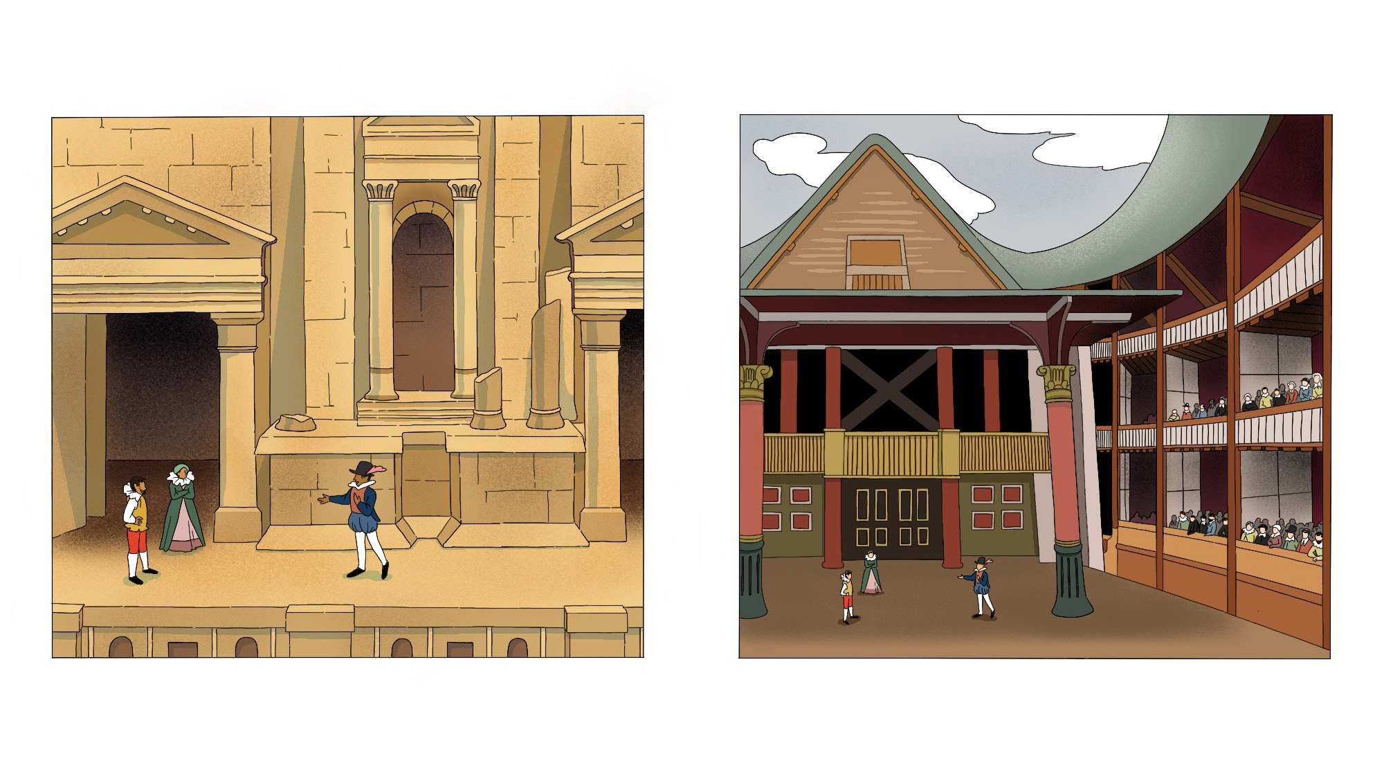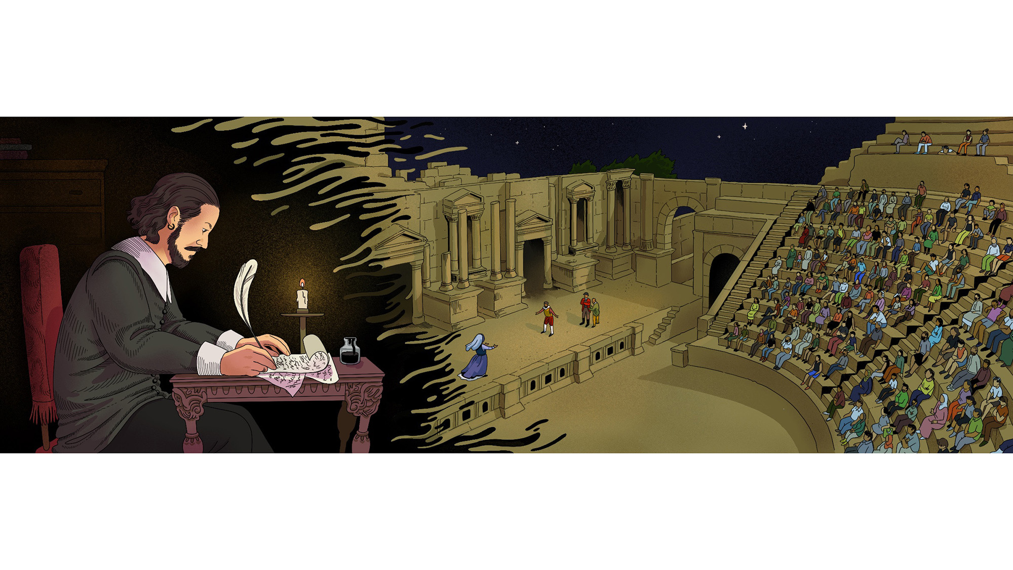 المشهد لا يدور في لندن، بل يتردد صداه بين مسارح حديثة وأطلال المدرّجات الرومانية المنتشرة في أرجاء الشرق الأوسط، حيث ينساب صوت مألوف – صوت شكسبير. فكلماته، وإن وُلدت تحت سماء بعيدة، تجد لها أصداءً جديدة في الحجر وعلى خشبة المسرح على حدٍّ سواء. وفي ذلك السكون الرقيق القائم بين الثقافات وتعاقب الأزمنة، تستأنف الدراما الخالدة مسيرتها.