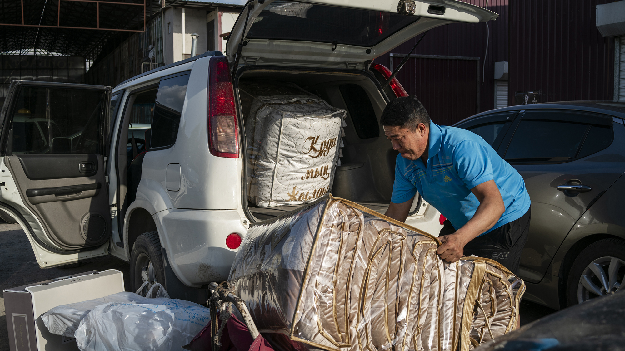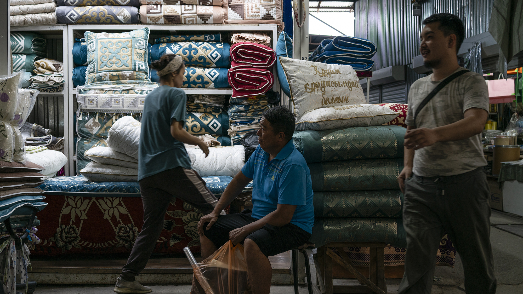 بائعو الكوراك كوربي في سوق أرلان في ألماتي: مراتب النوم واللحف المصنوعة بفن حياكة الرقع التقليدي وغيرها من السلع.