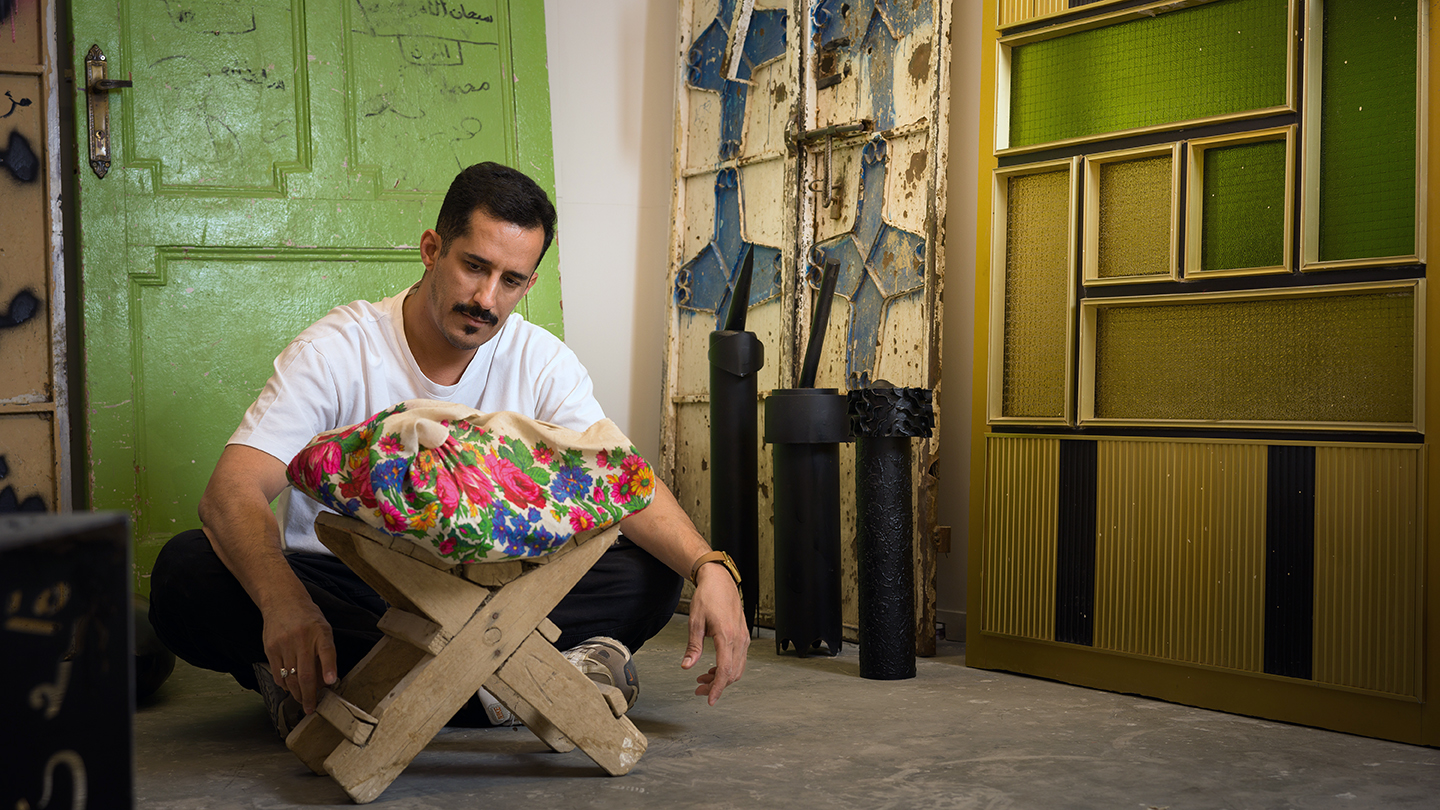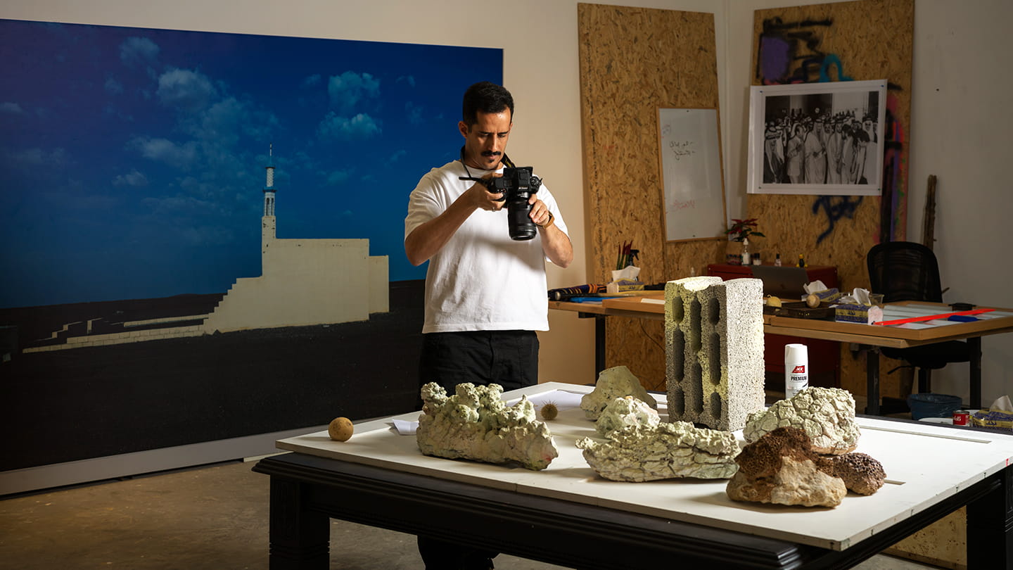معاذ العوفي في إستوديو "المثبى" الذي أسسه في مدينة الرياض.