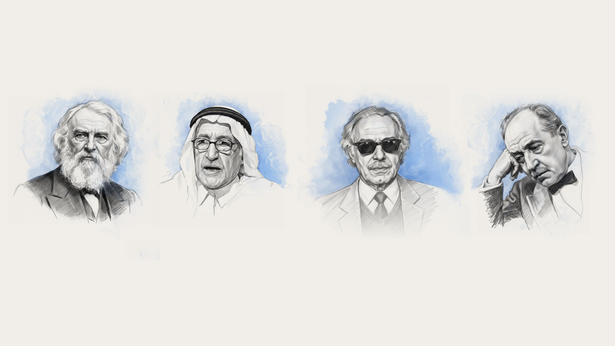 من اليمين: أحمد شوقي، محمود البريكان، محمد العلي، هنري وادزورث لونغفيلو.
